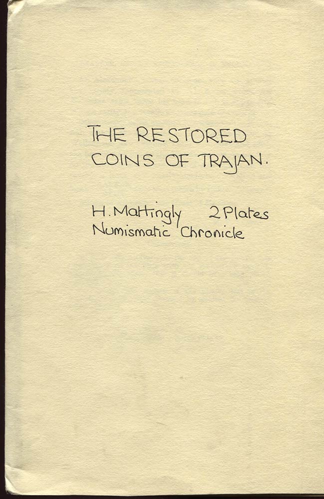MATTINGLY H. - The restored coins of Trajan. London, s.d. pp. 232 – 278, tavv. 2. Ril. muta, buono stato, raro e importante.