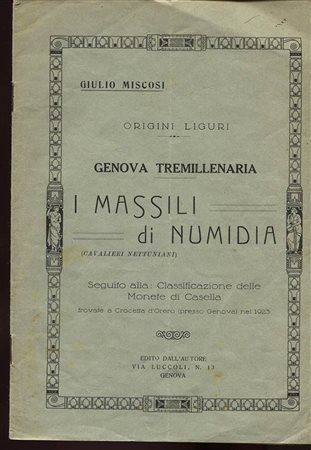 MISCOSI G. – Origini liguri; Genova tre millenaria. I Massili di Numidia ( Cavalieri nettuniani). Genova, 1927. Pp. 16, ill. nel testo. ril. editoriale, buono stato, molto raro e importante.