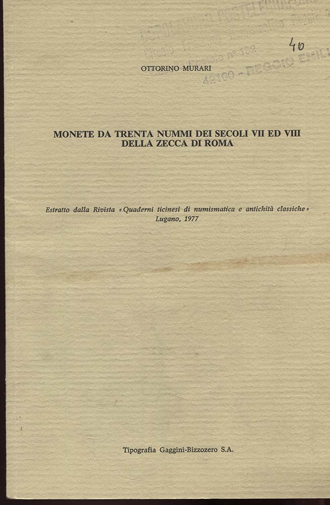 MURARI O. – Monete da trenta nummi dei secoli VII ed VIII della zecca di Roma. Lugano, 1977. Pp. 317 – 339, tavv. 5. Ril. Ed. Buono stato, importante lavoro.