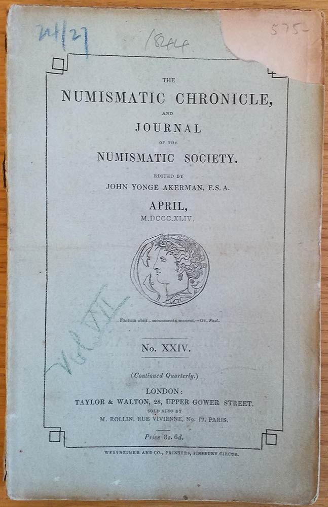 Numismatic Chronicle and Journal of the Numismatic Society. London John Yonge Akerman April 1844 No. XXIV. Brossura ed. pp. VII, 44, 16, tavv. IV in b/n. Dorsetto parzialmente mancante. Buono stato. Contents: Edward Hoare On some