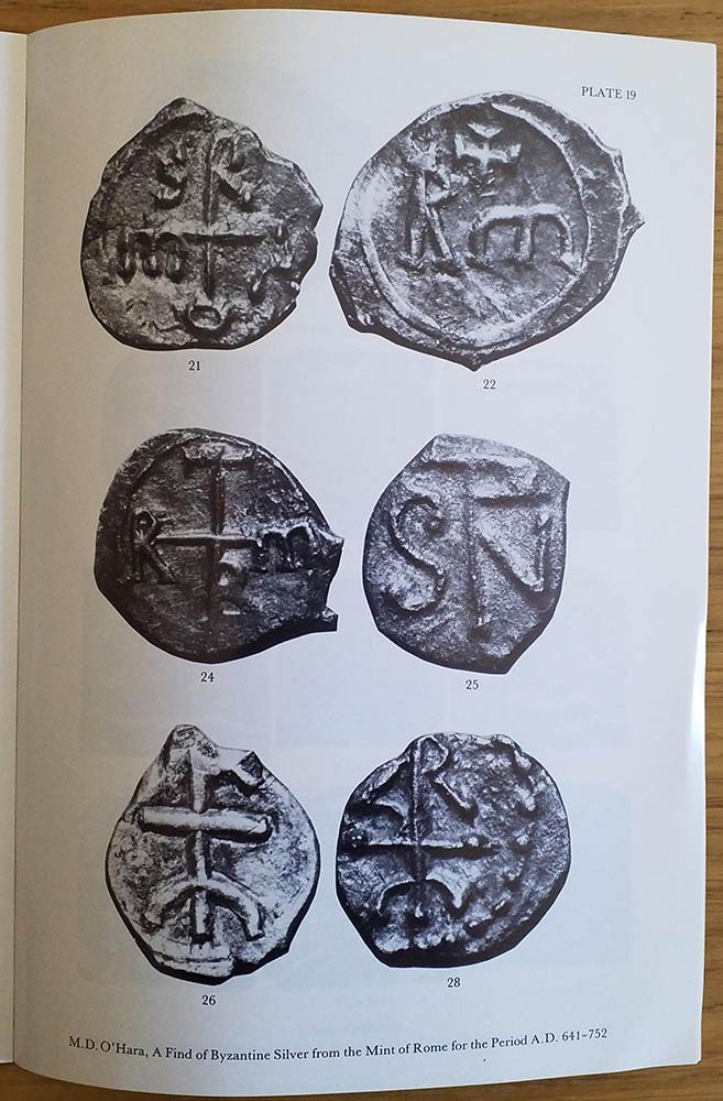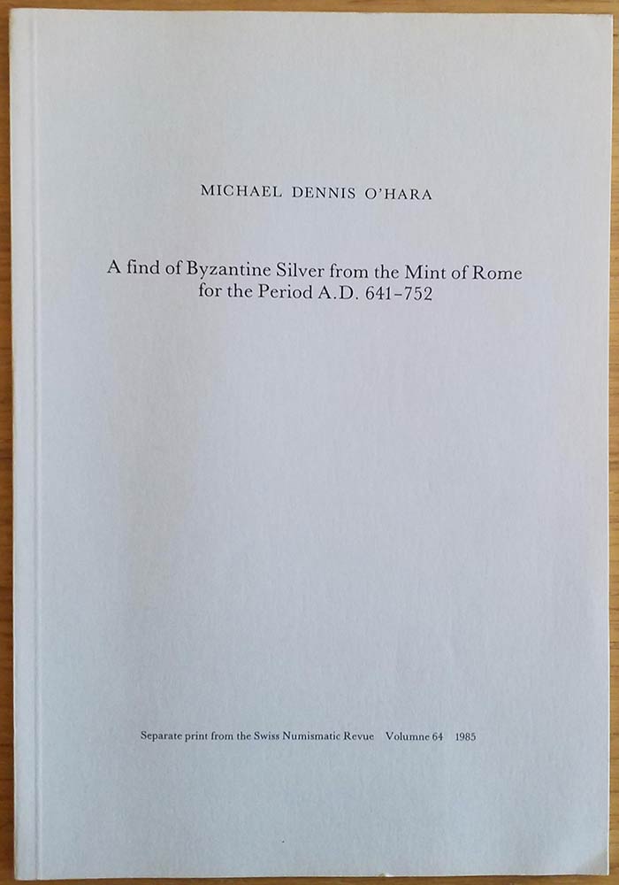 O' Hara M.D. A find of Byzantine Silver from the Mint of Rome for the Period A.D. 641-752. Separate print from the Swiss Numismatic Revue Volumne 64 1985. Brossura ed. pp. Da105 a 140, tavv. Da 15 a 21 in b/n. Ottimo stato.
