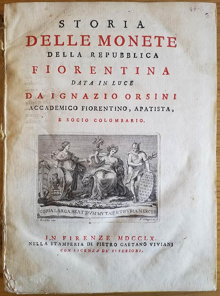 Orsini Ignazio Storia delle Monete della Repubblica Fiorentina. Firenze Pietro Gaetano Viviani 1760. Tutta Pergamena pp. 327, ill. in b/n. Legatura danneggiata. Buono stato. Raro
