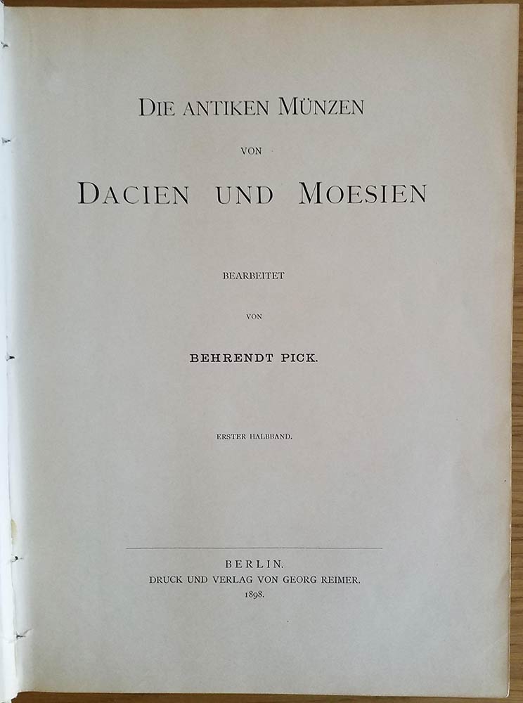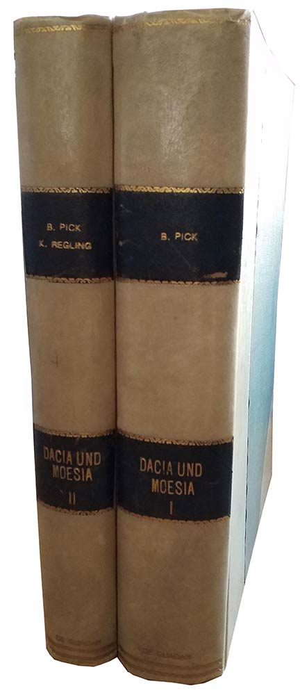 Pick B. 2 Voll. Die Antiken Munzen von Dacien und Moesien. Berlin 1898. Vol. I) Mezza Pelle con titolo in oro al dorso, pp. 518, tavv. XX in b/n. Vol. 2) Mezza Pelle con titolo in oro al dorso, pp. Da 520 a 920, tavv. 1 in b/n. Buono stato.