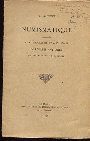 SAGNIER A. – Numismatique appliqee a la topografie et a l’histoire des Villes Antiques. Avignon 1890\91. Pp. 22, 23, 23. N° 3 fascicoli. Ril. editoriale sciupata, rari.