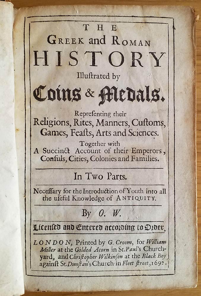 Walker O. The Greek and Roman History Illustrated by Coins & Medals: Representing Their Religions, Rites, Manners, Customs, Games, Feasts, Arts and Sciences. Together with a Succinct Account of Their Emperors, Consuls, Cities, Colonies and Families. In Two Parts. Necessary for the Introduction of Youth Into All the Useful Knowledge of Antiquity. London 1692. Mezza Pelle con titolo in oro al dorso, pp. 360. Buono stato