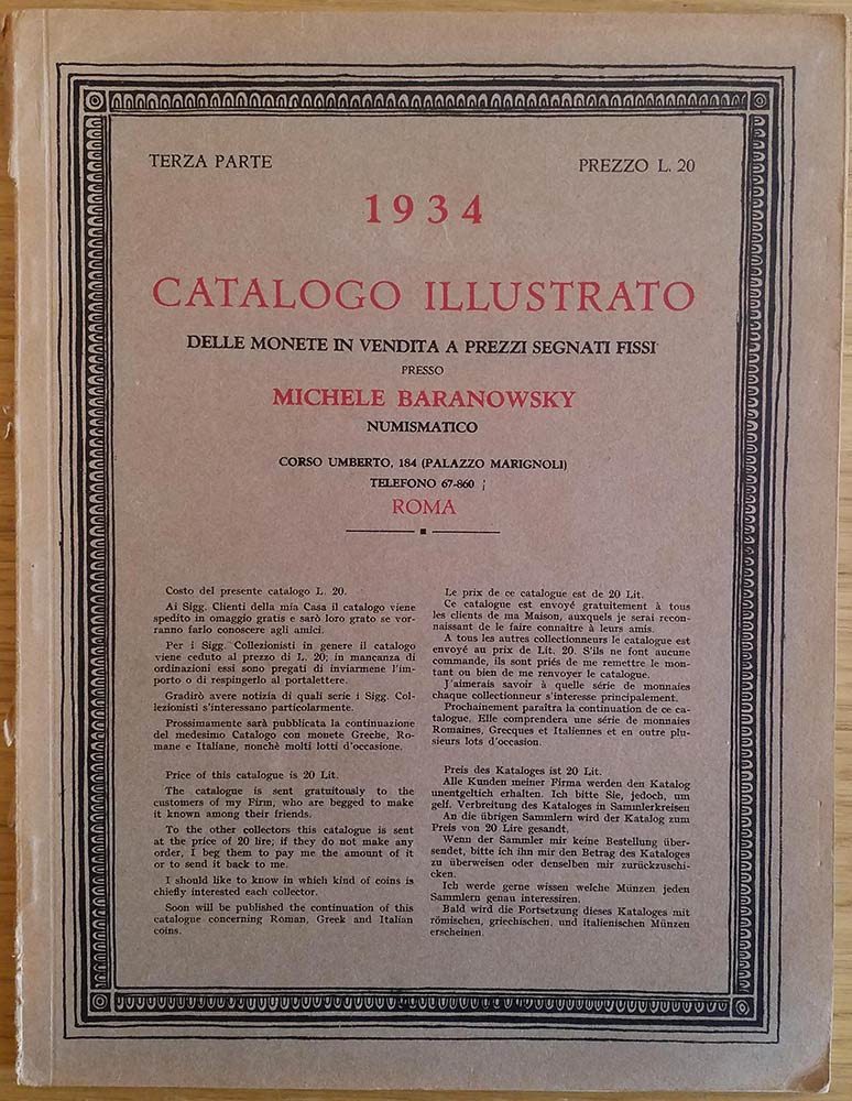 Baranowsky M. Catalogo illustrato delle monete in vendita a prezzi fissi. Parte Terza. Roma 1934. Brossura ed. pp. Da 121 a 176, lotti da 4378 a 6506, tavv. 23 a 38 in b/n. Buono stato