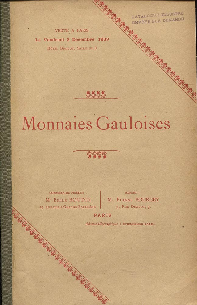 Lotto 2176 | BOURGEY – BOUDIN – Monnaies Gauloises. Paris 3 Décembre 1909. Pp. 24, nn. 339. Ril.ed. Buono stato