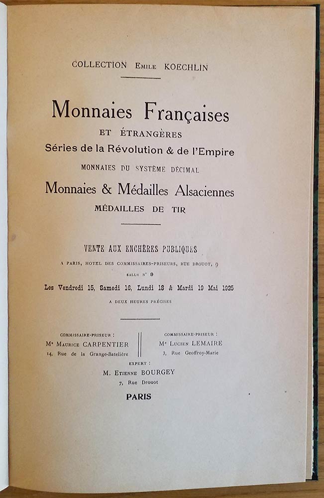 BOURGEY ETIENNE – Paris 15/19-Mai.1925. Collection Emile Koechlin. Monnaies francaises et entrangeres. Series de la Revolution & de l’Empire, monnaies du systeme decimal. Monnaies & medailles Alsaciennes. Medailles du tir. pp. 56,