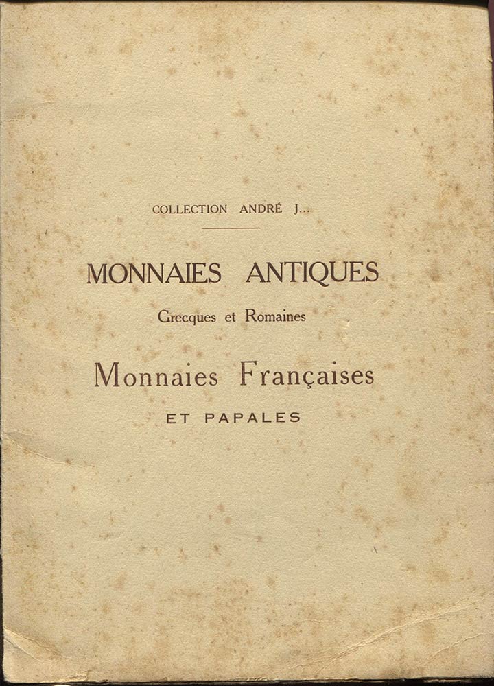 BOURGEY – CARPENTIER – Collection André J. Monnaies Francaises et papales. Paris, 21 dicembre 1929. Pp. 31, 8 tavv. Nn. 652. Ril.ed sciupata. Buono stato