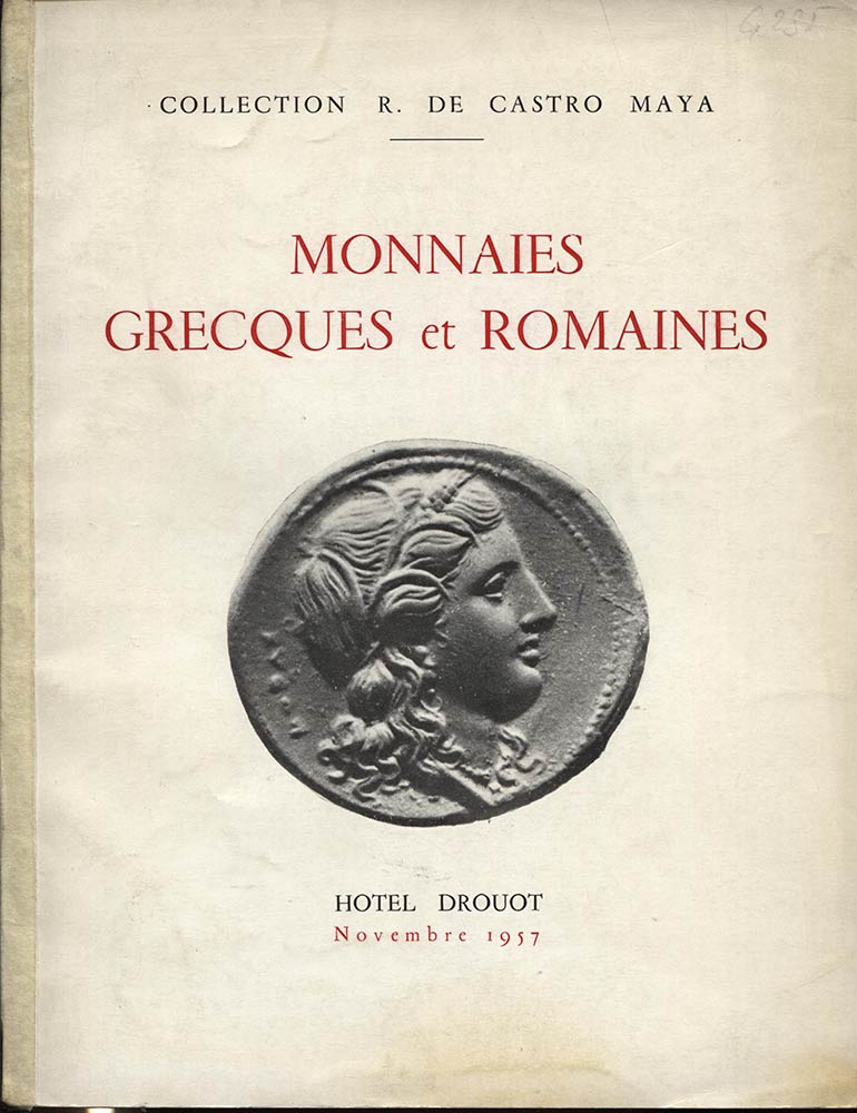 Lotto 2183 | BOURGEY E. –Collection R. DE CASTRO MAYA. Très importante collection de monnaies Grecques et Romaines en or, en electrum et en argent. Paris, 18 Novembre 1957. Pp.42, 10 tavv. Nn. 389. Ril.ed. Buono stato