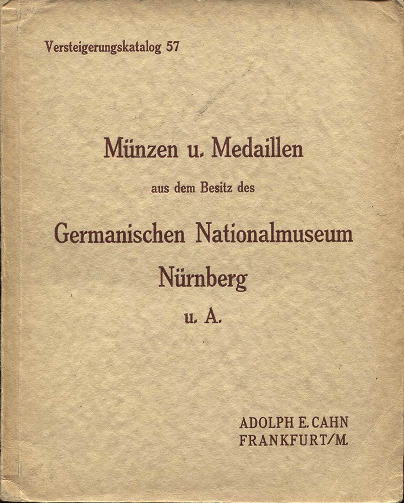 CAHN A. – Versteigerungskatalog 57. Munzen u. Medaillen aus dem Besitz des Germinischen Nationalmuseum Nurnberg u. A. Frankfurt, 26 oktober 1926. Pp. 166 + 37 tavv. Nn. 2452. Ril.ed. Buono stato
