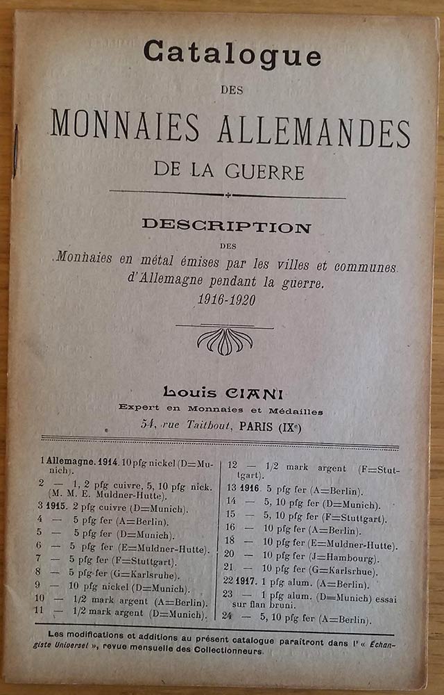 Ciani L. Catalogue des Monnaies Allemandes de la Guerre. Description des Monnaies en metal emises par les villes et communes d' Allemagne pendant la guerre 1916-1920. Brossura ed. pp. 19, lotti 852. Buono stato
