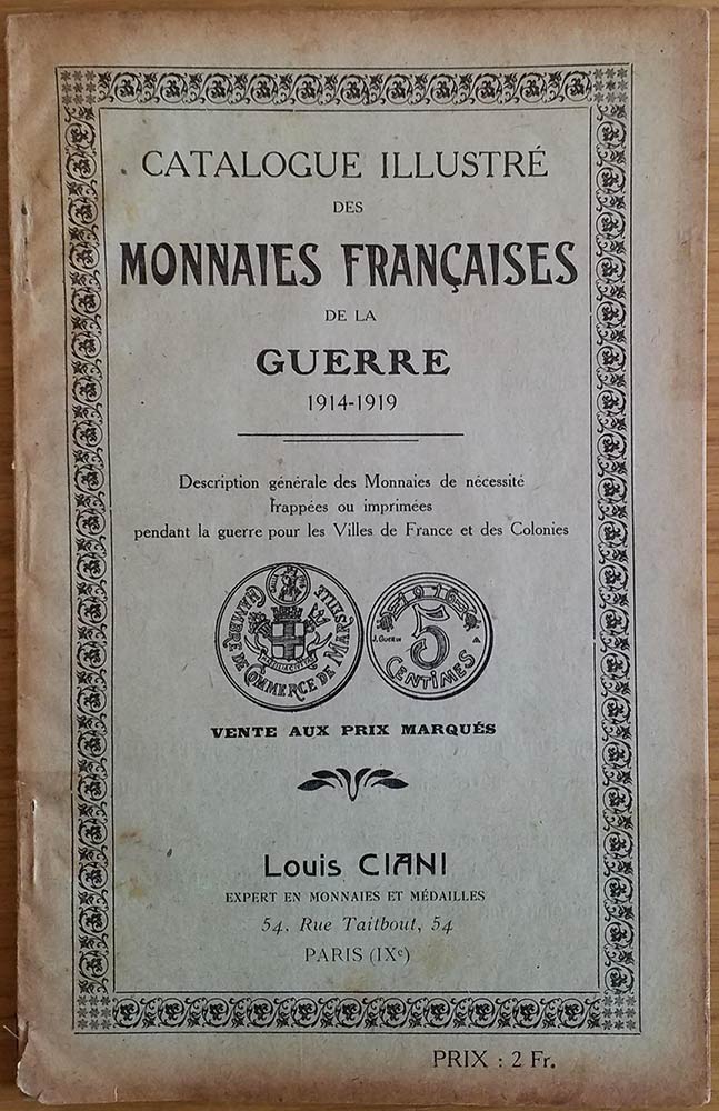 Ciani L. Catalogue illustrè des Monnaies Francaises de la Guerre 1914-1919. Description generale des Monnaies de necessite frappees ou imprimees pendant la Guerre pour les Villes de France et des Colonies. Paris 1920 (circa). Bros