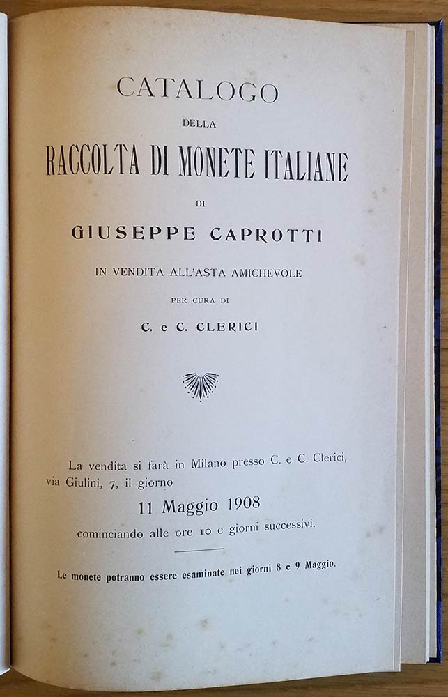 CLERICI C.& C. – Milano, 11-Maggio-1908. Catalogo della raccolta di monete italiane di Giuseppe Caprotti. pp. 126, nn.2209, tavv. 3 ril./ tela raro