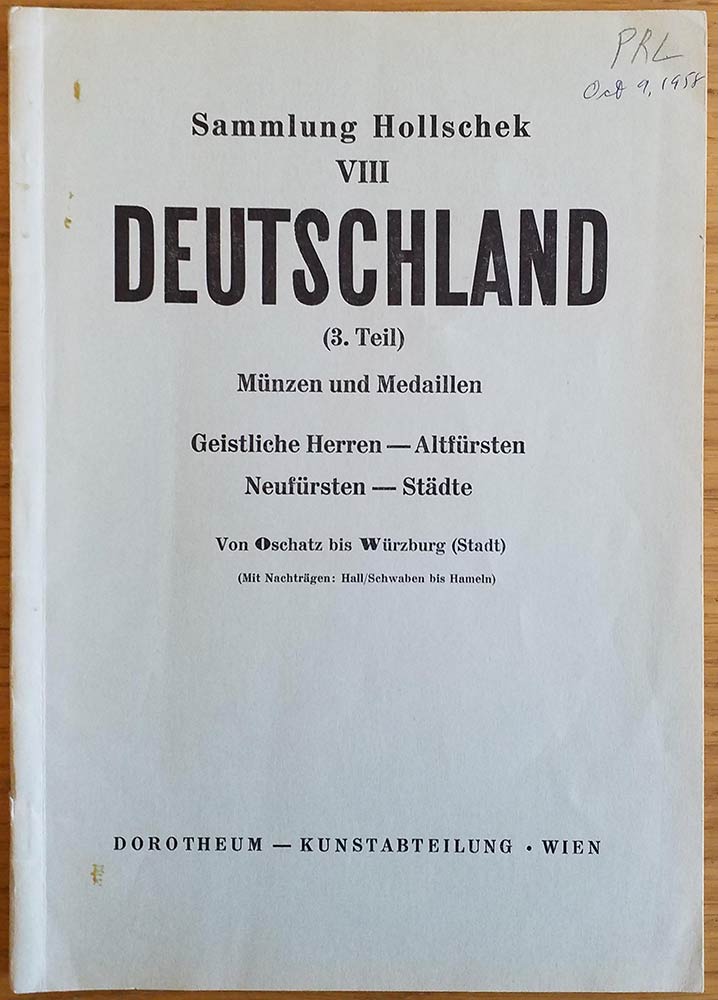 Lotto 2233 | Dorotheum Sammlung Hollschek VIII Deutschland (3 Teil) Munzen und Medaillen. Wien 09-10-11 Oktober 1958. Brossura ed. pp. 62, lotti da 2582 3721, tavv VIII ion b/n. Buono stato