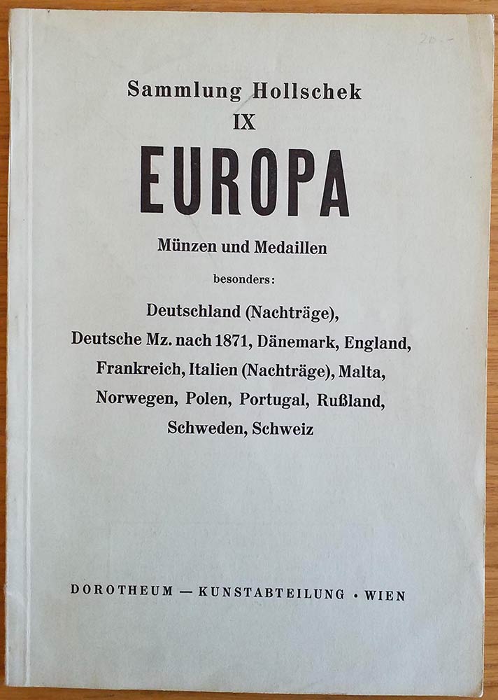 Dorotheum Sammlung Hollschek IX Europa Munzen und Medaillen. Wien 16-17-18 April 1959. Brossura ed. pp. 82, lotti 1879, tavv.XII in b/n. Buono stato