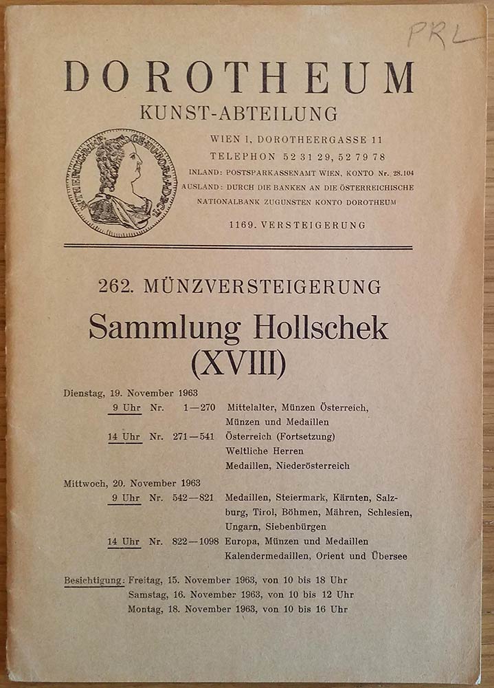 Dorotheum Sammlung Hollschek (XVIII).Wien 15-16-18 November 1963. Brossura ed. pp. 44, lotti 1098, tavv. VIII in b/n. Con lista dei prezzi di realizzo. Buono stato