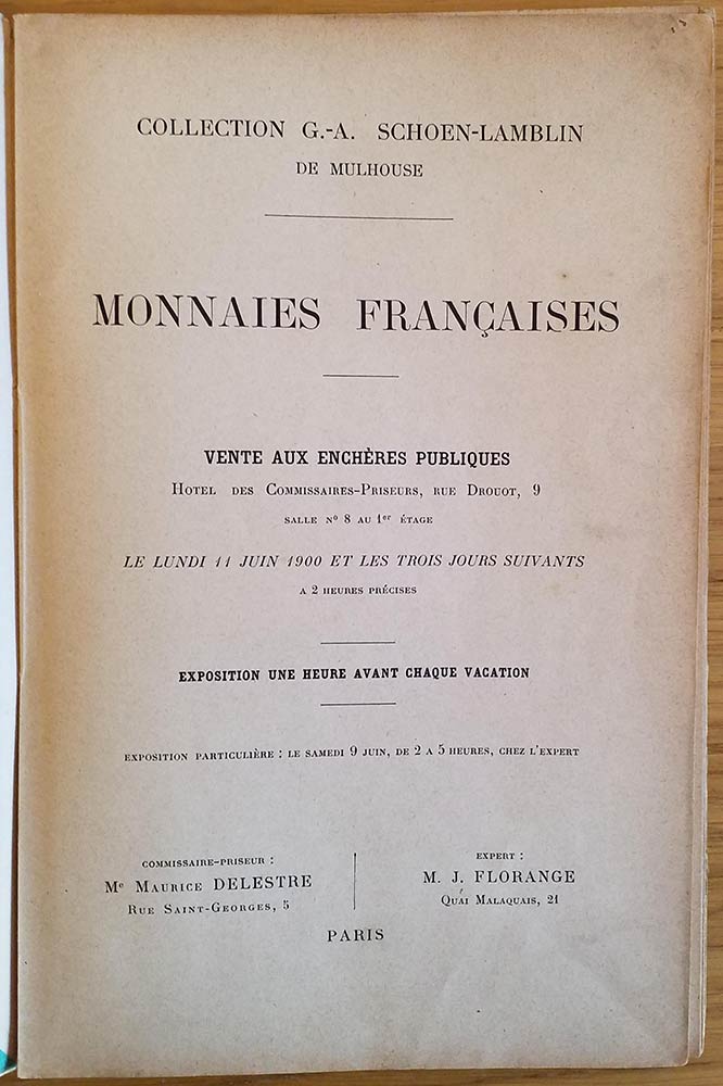 FLORANGE J. M. – Paris, 11-6-1900. Collection G.- A. Schoen-Lamblin de Mulhouse. Monnaies francaise. pp. 89, nn.2738, tavv.4.