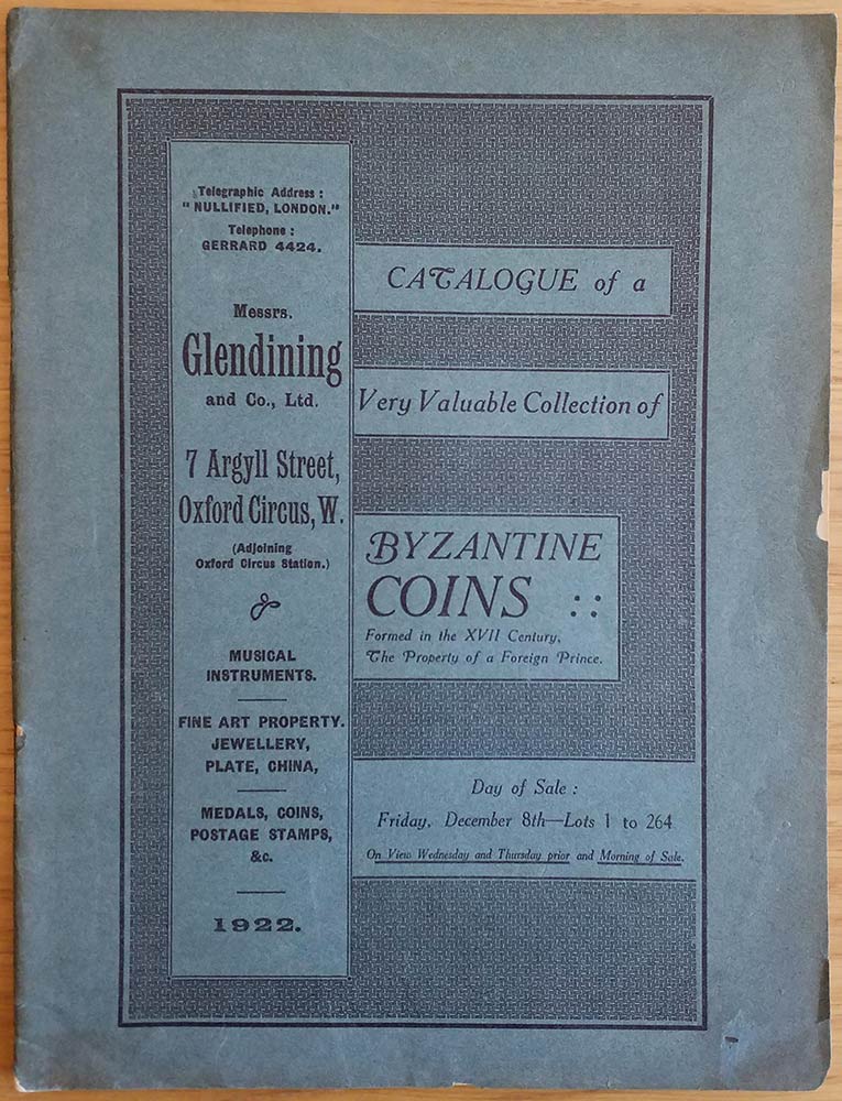 Lotto 2277 | Glendening & Co. Catalogue of a Very Valuable Collection of Byzantine Coins formed in the XVII Century, The Property of a Foreign Prince. London 08 December 1922. Brossura ed. pp. 25, lotti 264, tavv. 2 in b/n. Buono stato