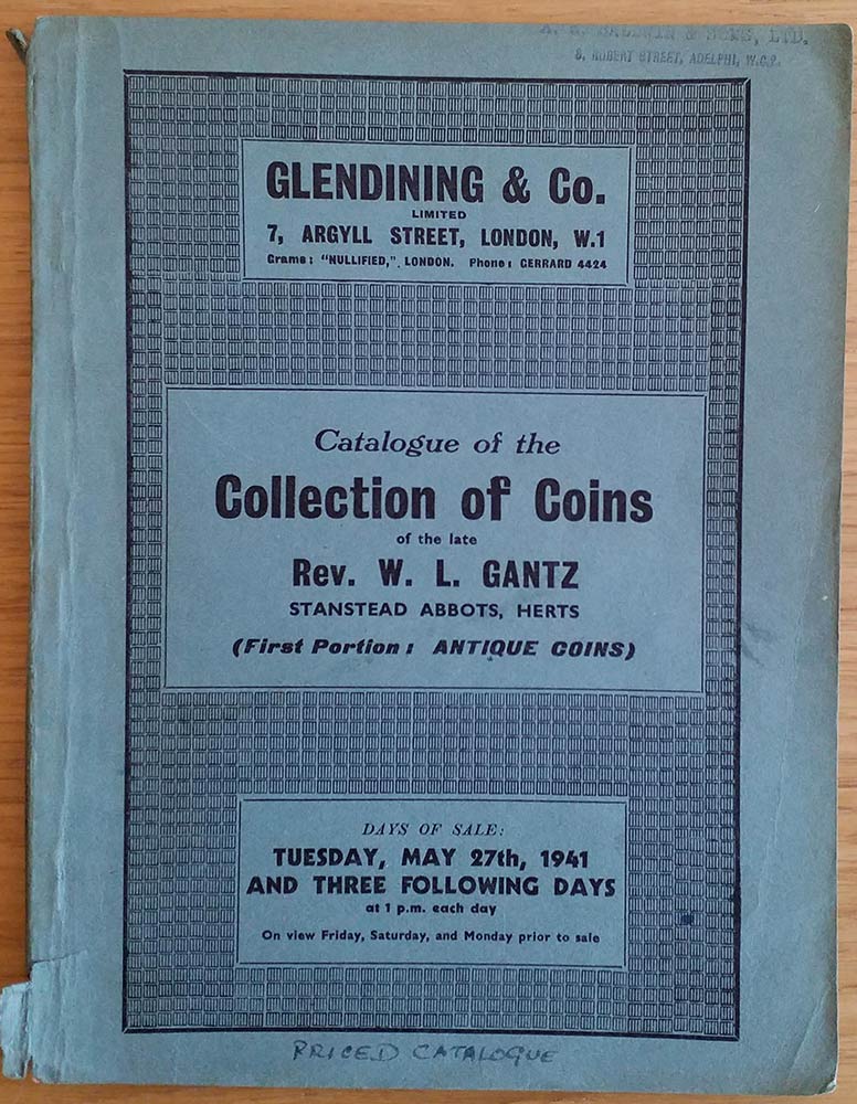 Glendening & Co. Catalogue of the Collection of Coins of the Late Rev. W.L.Gantz Stanstead Abbots, Herts (First Portion: Antique Coins). London 27 May 1941. Brossura ed. pp. 82, lotti 985, tavv. VI in b/n. Note a matita dei prezzi