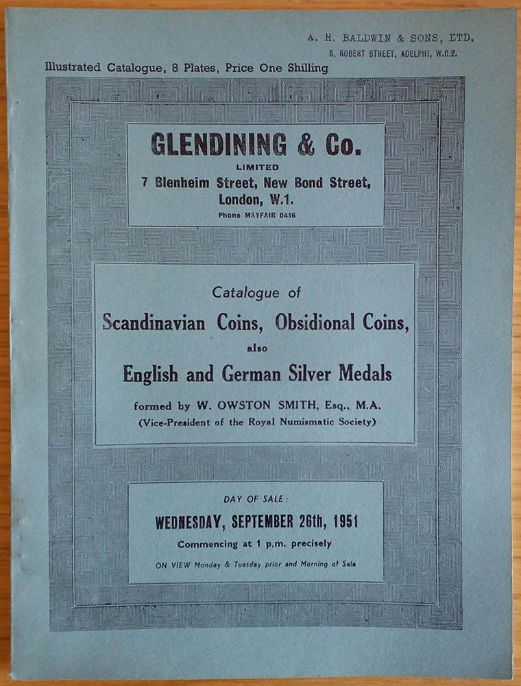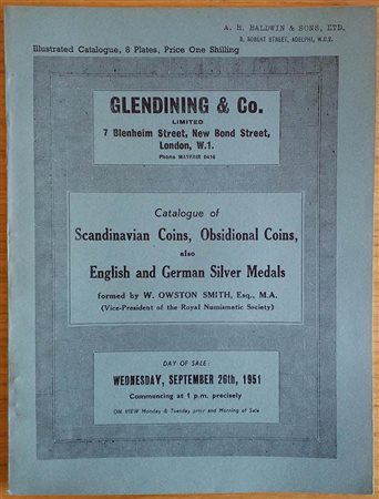 Glendining & Co. Catalogue of Scandinavian Coins, Obsidional Coins, also English and German Silver Medals formed by W. Owston Smith Esq., M.A. ( Vice President of the Royal Numismatic Society). London 26 September 1951. Brossura e