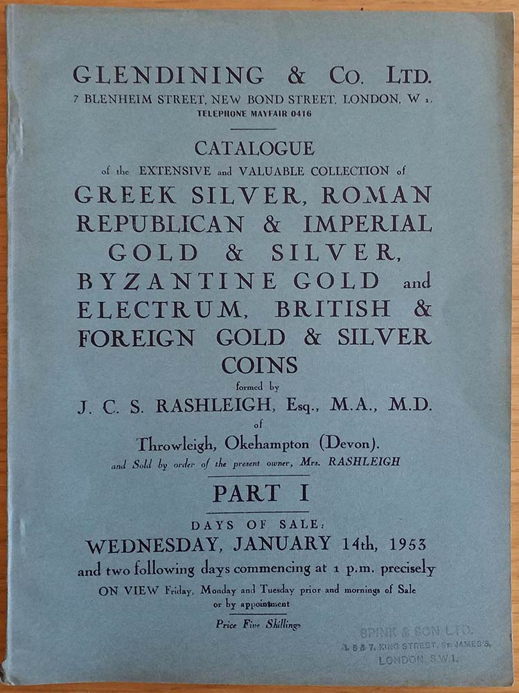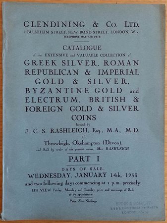 Glendening & Co. Catalogue of the Extensive Collection of Greek Silver, Roman Republican & Imperial Gold and Silver, ByzantinevGold and Electrum, British and Foreign Gold ans Silver Coins, formed by J.C.S. Rashleigh Esq. M.A., M.D