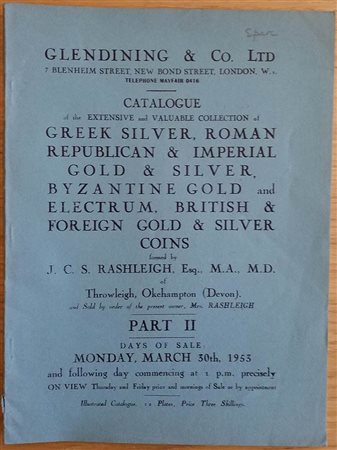 Glendening & Co. Catalogue of the Extensive Collection of Greek Silver, Roman Republican & Imperial Gold and Silver, Byzantine Gold and Electrum, British and Foreign Gold ans Silver Coins, formed by J.C.S. Rashleigh Esq. M.A., M.D. Of Throughleigh, Okehampton (Devon). Part. II. London 30 March 1953. Brossura ed. pp. 39, lotti 543, tavv. XII in b/n. Buono stato.