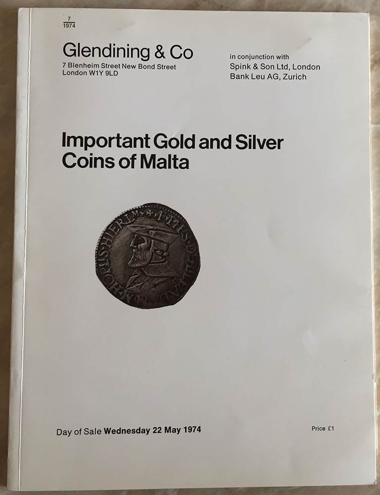 Glendening & Co. In Conjunction with Spink & Son London Bank Leu AG Zurich Catalogue of Important Collection Gold and Silver Coins Malta. 22 May 1974. Brossura ed. pp. 63, lotti 349, ill. in b/n. Con lista prezzi di realizzo. Buon