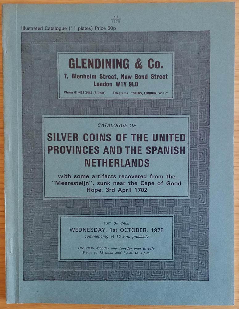 Glendening & Co. Catalogue of Silver Coins of the United Provinces and the Spanish Netherlands, with some Artifacts recovered from the 'Meeresteijn', Sunk near the Cape of Good Hope 3 rd April 1702. London 01 October1975. Brossura