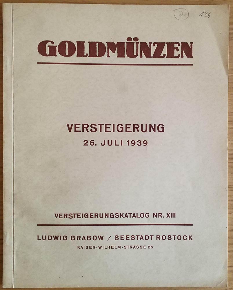 Grabow L. Goldmunzen Sammlungen L.U. SCH. 26 Juli 1939. Brossura ed. pp. 18, lotti da 2001 a 2484, tavv.10 in b/n. Con lista prezzi. Buono stato.