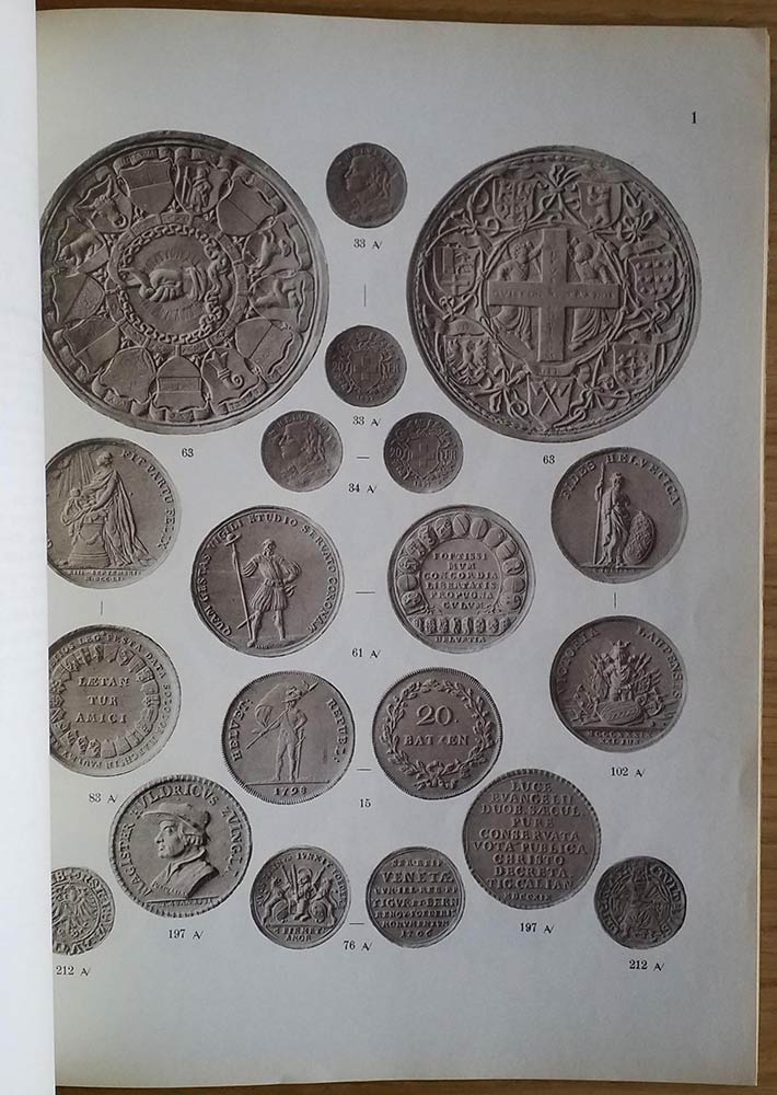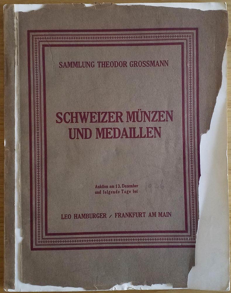 Hamburger L. Sammlung Schweizer Munzen und Medaillen des Herrn Theodor Grossmann, Genf. 13 Dezember 1926. Brossura ed. pp. 159, lotti 3249, tavv. 17 in b/n. Copertina anteriore staccata e con mancanze. Buono stato