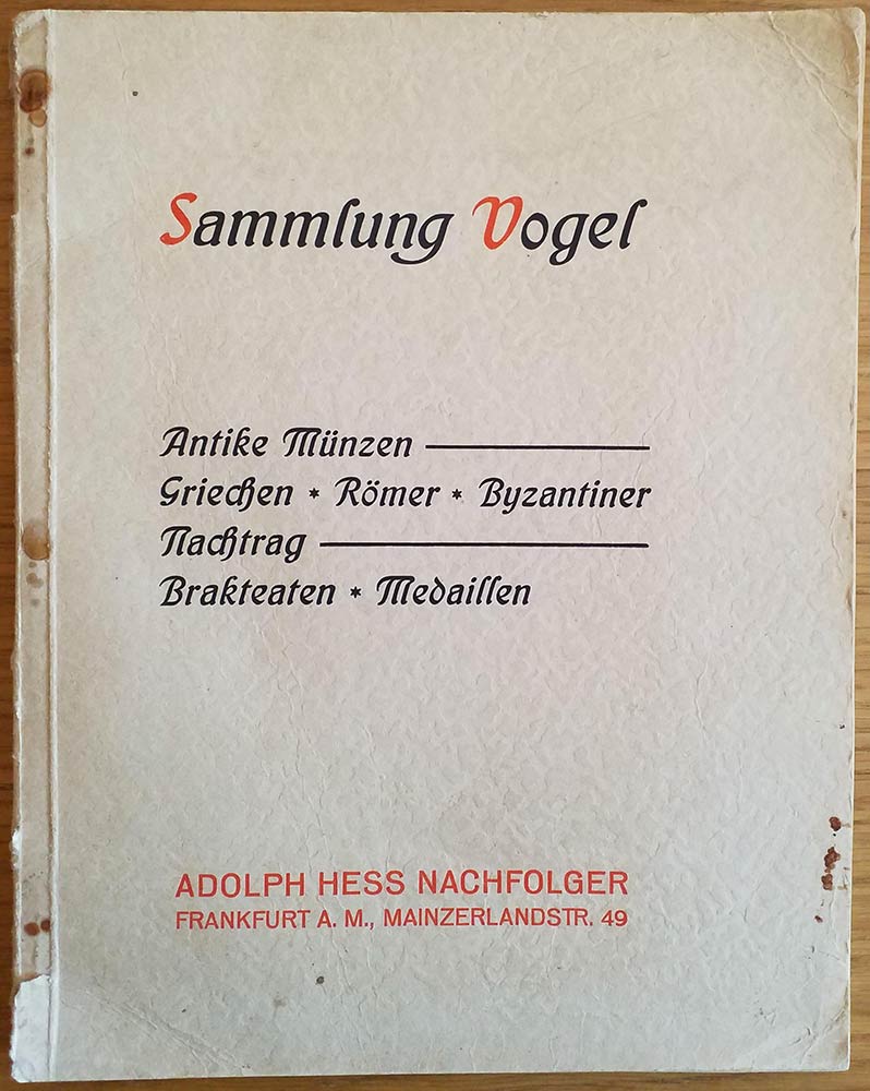 Hess A. Sammlung Vogel, Griechen, Romer, Byzantiner, Brakteaten, Medaillen. 25 Mars 1929. Brossura ed. pp. 73, lotti 1241, tavv. 32 in b/n. Copertina staccata. Buono stato