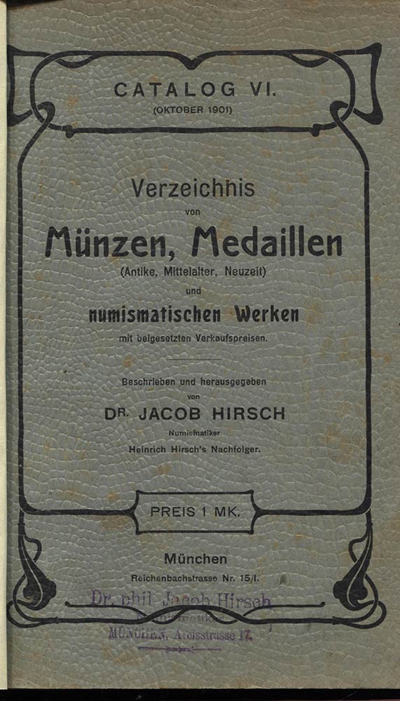 HIRSCH J. – Catalog VI. Oktober, 1901. Munzen und medaillen antike, mittelalter, neuzeit