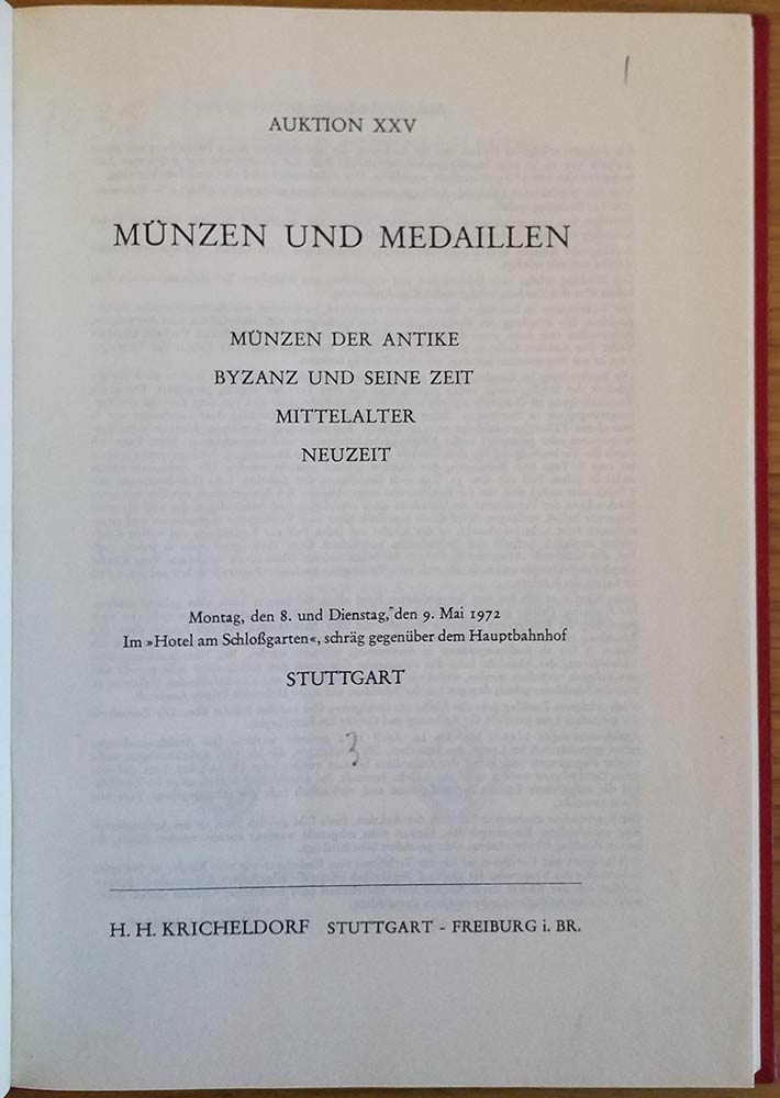 Kricheldorf H.H. Auktion XXV, 9 May 1972. Tela con titolo in oro al dorso pp. 99, lotti 1881, tavv. XXXIX, in b/n. Ottimo stato.