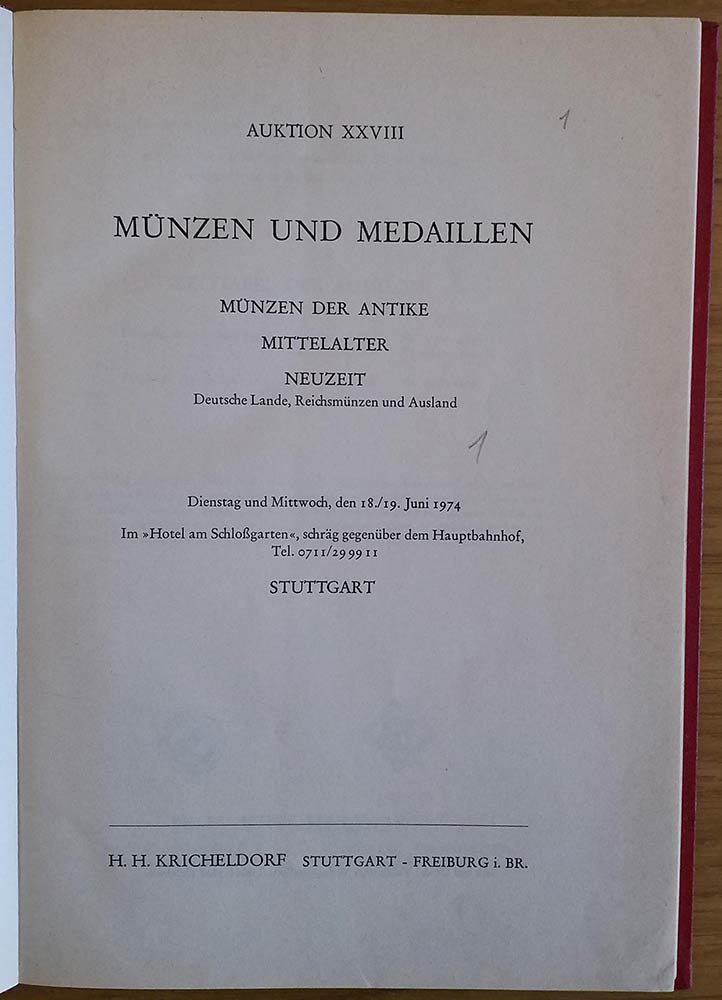 Kricheldorf H.H. Auktion XXVIII. Munzen und Medaillen. Munzen der Antike, Mittelalter, Neuzeit. 18-19 Juni 1974. Tela con titolo in oro al dorso, pp. 112, lotti 1453, tavv. 60 in b/n. Buono stato