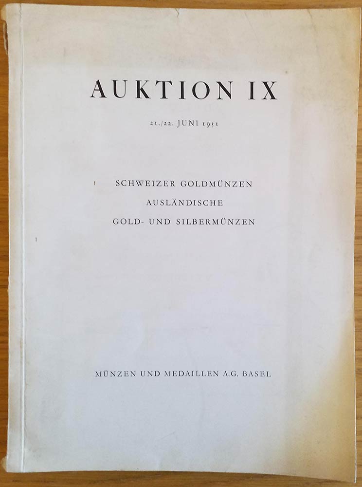 Munzen und Medaillen. Auktion IX. Goldmunzen: Schweiz, Deutschland, Spanien, Frankreich, Italien Niederlande, Polen, Portugal, Schweden. Silbermunzen: Danemark, Deutschland, Frankreich, Italien, Spezialserien Savoyen und Kirchenstaat, Niederlande, Polen, Schweden. Basel 21-22 Juni 1951. Brossura ed. pp. 36, lotti 529, tavv. 24 in b/n. Buono stato.