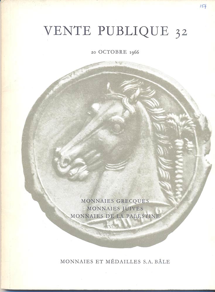 MONNAIES ET MEDAILLES. Vente 32. Monnaies grecques, mannaie Juives, mannaie de la Palestine. Basel, 20 – Octobre – 1966. Pp 52, nn. 529, tavv. 32. Ril. editoriale, buono stato, lista prezzi Val. importante SPRING 459.