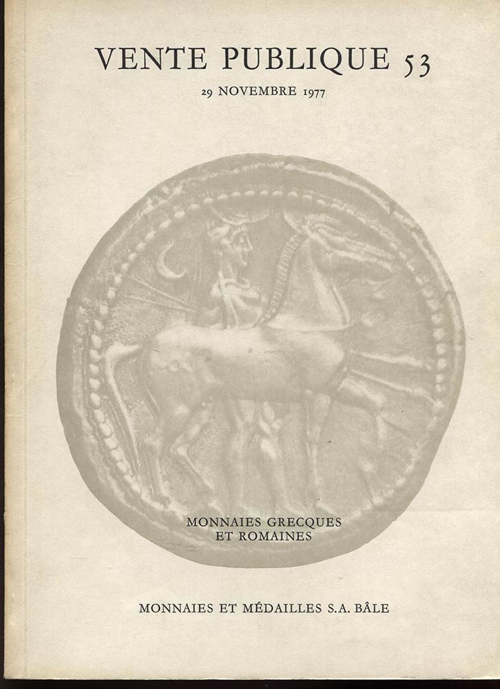 MONNAIES ET MEDAILLES. Vente 53. Monnaies Grecques et romaines. Basel, 29 – Novembre – 1977. Pp. 50, nn. 306, tavv.24 + 1 a colori. ril.ed. buono stato.