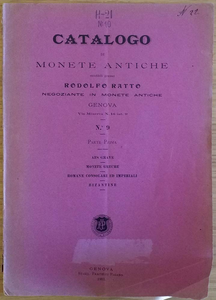 RATTO RODOLFO – Genova 1903 N° 9 parte I. Catalogo di monete antiche, Aes Grave,monete greche, monete romane consolari ed imperiali, bizantine. pp. 53, nn. 1027. raro