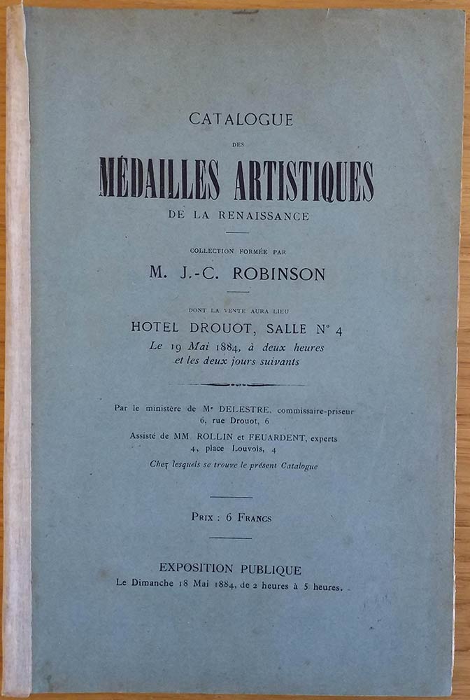ROLLIN & FEUARDENT – Paris 19-5-1884. Catalogue des medailles artistiques de la renaissance. Collection formee par M. J.-C. Robinson. pp. 73, nn. 271, tavv. 4. molto raro e importante
