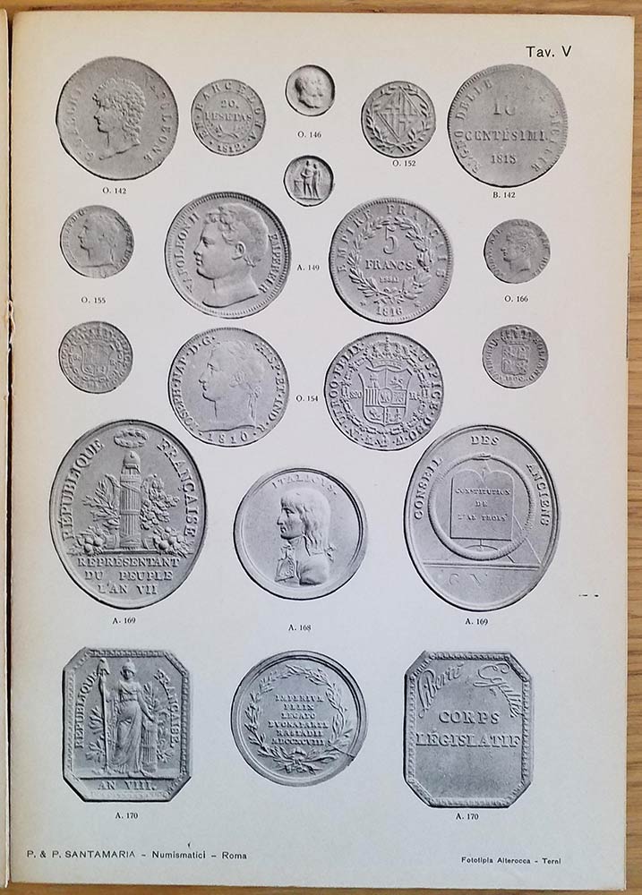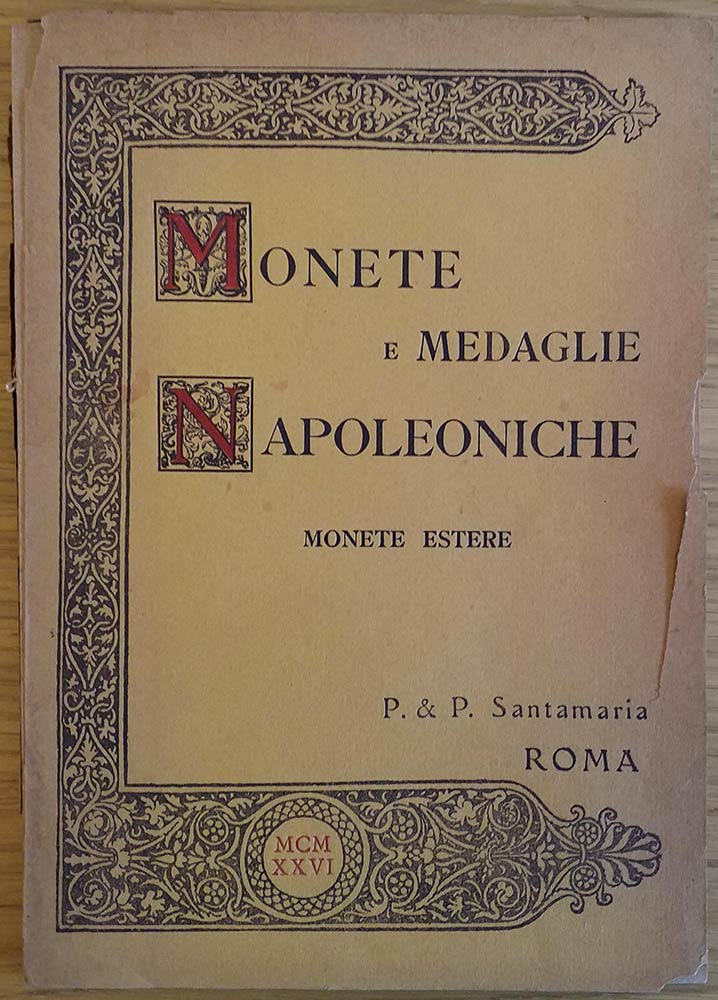 Santamaria P.& P. Monete e Medaglie Napoleoniche Monete Estere D'Oro. Roma 27 Maggio 1926. Brossura ed. pp. 36, lotti 314, tavv. XII in b/n. Parzialmente slegato. Buono stato.