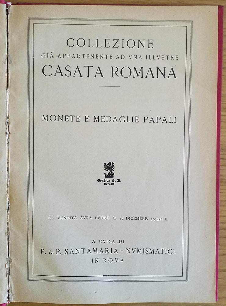 Santamaria P.P. Collezione gia' appartenuta ad una illustre Casata Romana. Monete e Medaglie Papali. 17 Dicembre 1934. Tela con titolo in oro al dorso, pp. 111, lotti 1033, tavv. XXIII in b/n. Buono stato