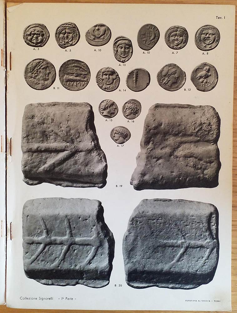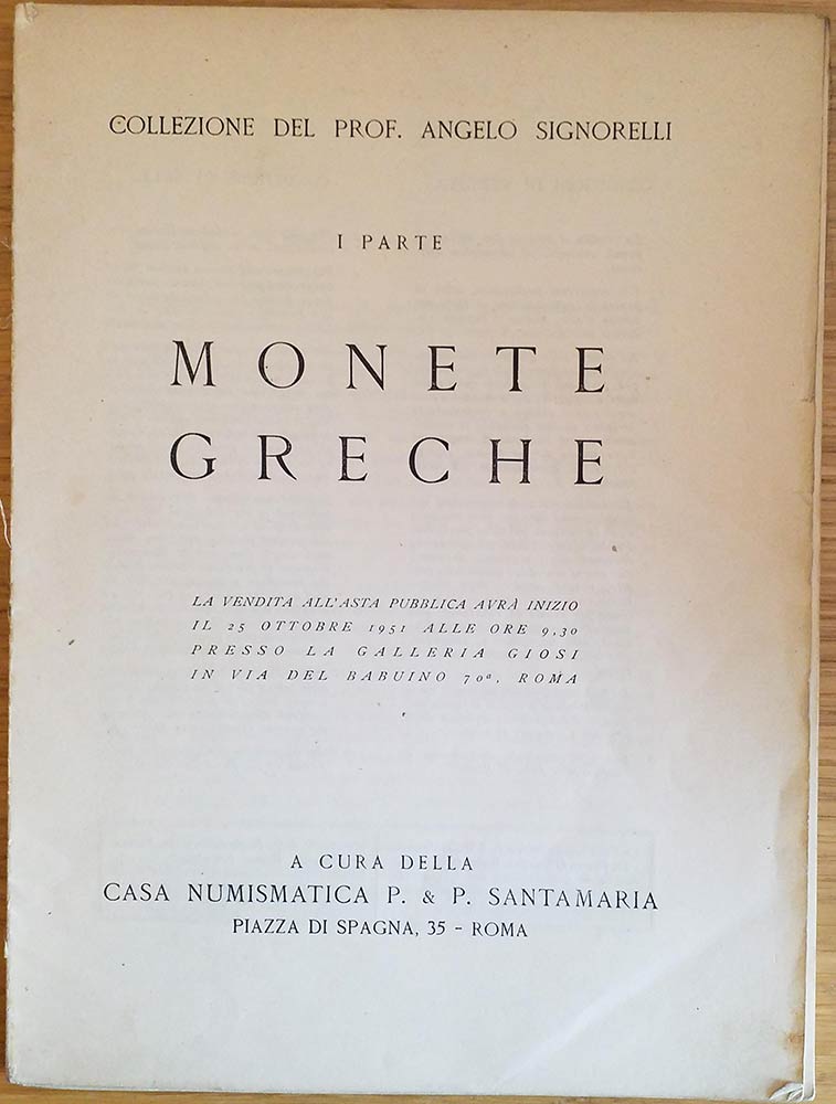 Santamaria P.& P. Collezione del Prof. Angelo Signorelli I Parte Monete Greche. Roma 25 Ottobre 1951. Brossura ed. pp. 54, lotti 612, tavv. XVII in b/n. Note a penna dei prezzi di realizzo. Parzialmente slegato. Manca copertina. B
