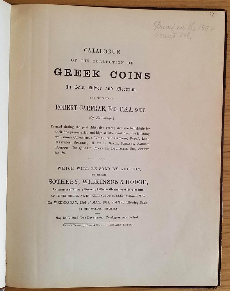 Sotheby, Wilkinson & Hodge Catalogue of the Collection of Greek Coins in Gold, Silver and Electrum, the property of Robert Carfrae, ESQ. F.S.A. Scot. Formed during past thirty-five years; and selected chiefly for their fine preser