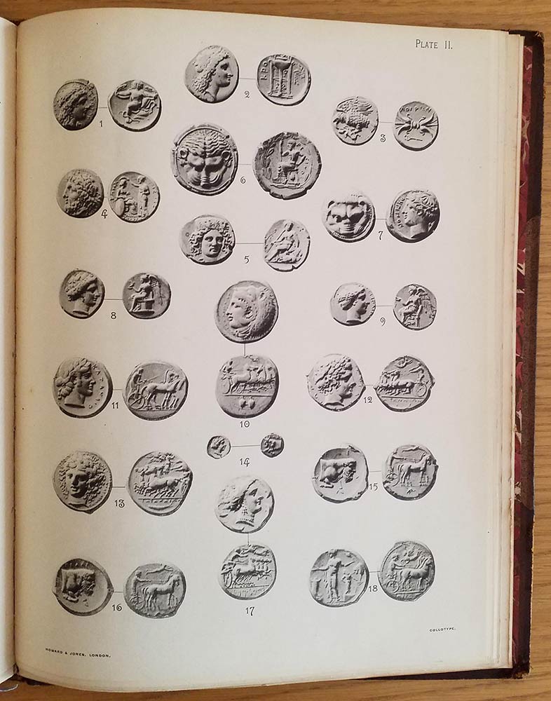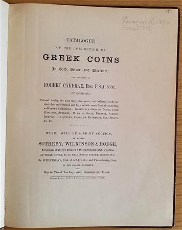 Sotheby, Wilkinson & Hodge Catalogue of the Collection of Greek Coins in Gold, Silver and Electrum, the property of Robert Carfrae, ESQ. F.S.A. Scot. Formed during past thirty-five years; and selected chiefly for their fine preservation and high artistic merit from the following well-know Collections: Wigan, San Giorgio, Duprè, Lord Hastings, Sparkes, H. de la Salle, Paravey, Sambon, Bompois, De Quelen, Comte de Duchastel, Sim, Spratt, etc. 23 May 1894. Mezzapelle, con titolo in oro al dorso, pp. 61, lotti 363, tvv. XI in b/n. Buono stato.