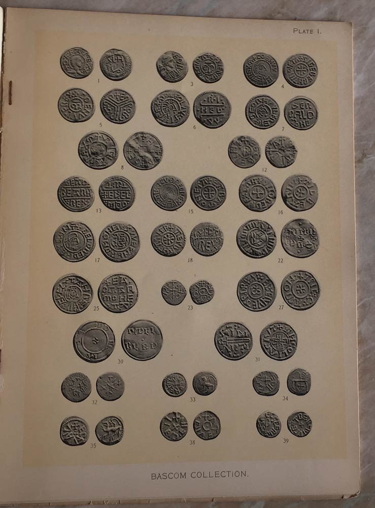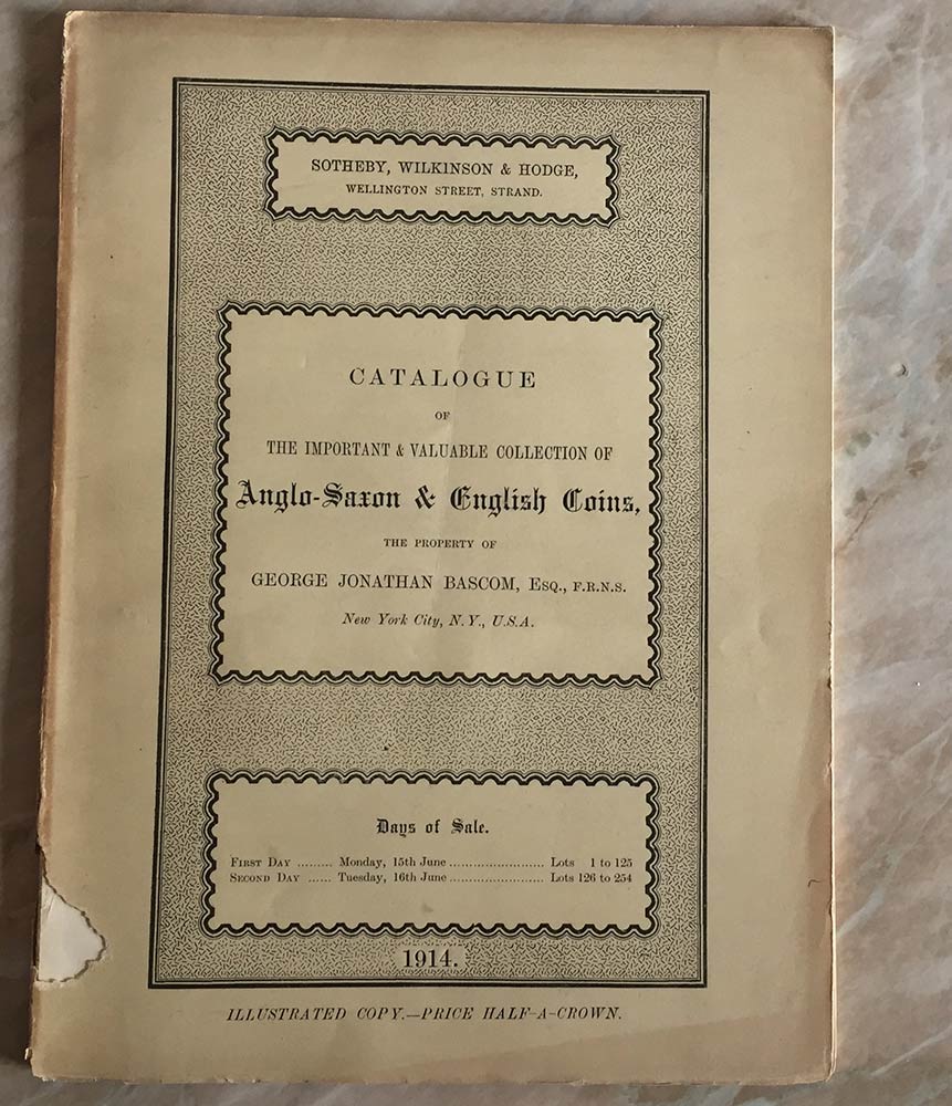 Sotheby, Wilkinson & Hodge Catalogue of the Important and Valuable Collection of Anglo- Saxon & English Coins including a Fine Series of English Copper, Tin & Bronze Coins. The Property of George Jonathan Bascon Esq. F.R.N.S.. London 15 June 1914. Brossura ed. pp. 45, lotti 254, tavv. VI in b/n. Piccola mancanza in copertina e al dorsetto. Buono stato
