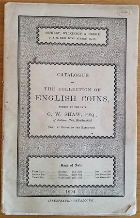 Sotheby, Wilkinson & Hodge Catalogue of a Collection of The Collection of English Coins, formed by the late G.W.Shaw, Esq. Of Botham Hall, Huddersfield. London 21-22-23 July 1924. Brossura ed. pp. 44, lotti 607. Buono stato.