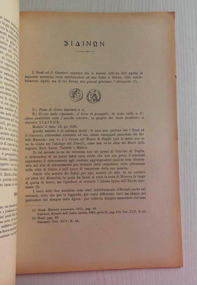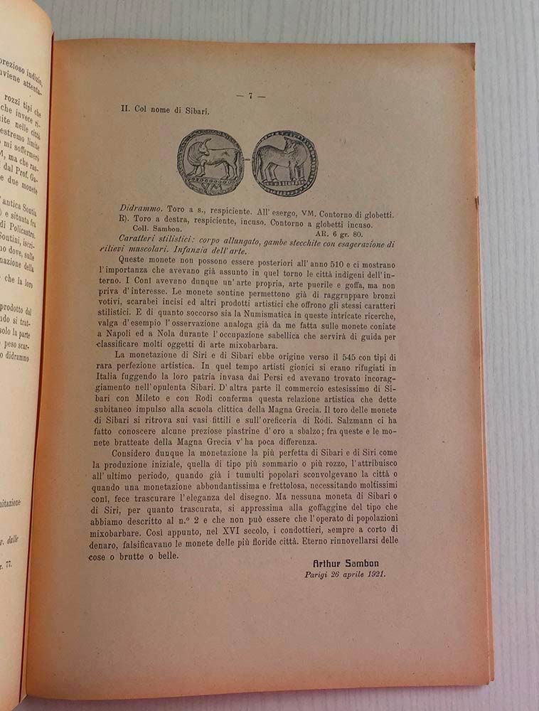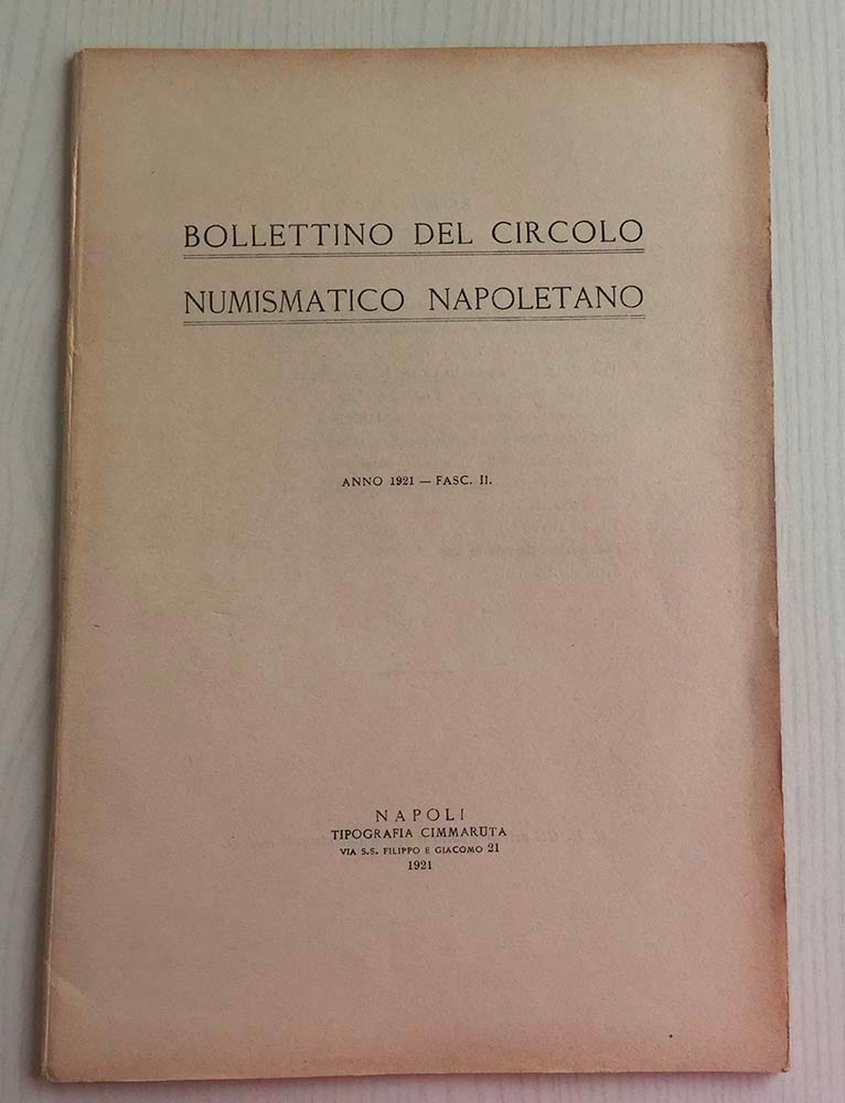 Bollettino del Circolo Numismatico Napoletano Anno 1921, Fasc. II. Napoli Cimmaruta 1921. Brossura ed. pp. 48. Dall'Indice: Arthur Sambon, Monetazione degli indigeni lucani nel VI secolo av. C.; Giulio de Petra, La Chiesa di S. Agrippino in Napoli; P. Calderoni Martini, Sidinon; Carlo Prota, Documenti per la storia della numismatica napoletana; Carlo Prota, Sulle monete napoletane di Carlo VIII di Francia; Buono stato