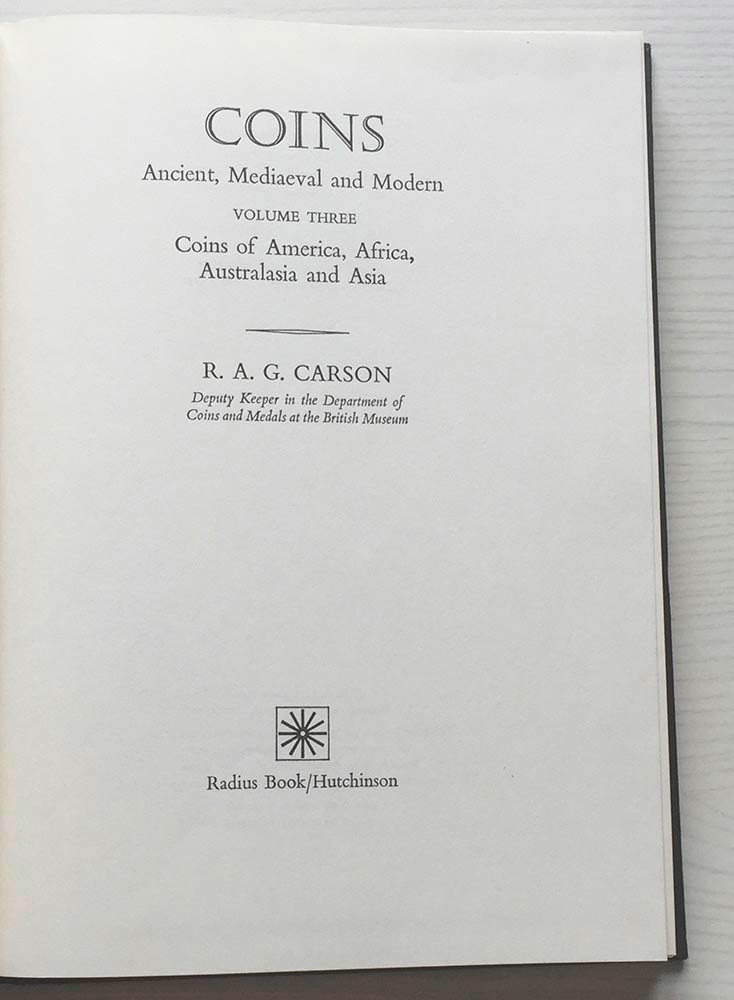 Carson R.A.G. Coins Ancient, Medieval and Modern. Coins of America, Africa, Australia and Asia. Vol. Three. Hutchinson 1971. Tela ed. con titoo in oro al dorso, pp. Da 416 a 452, tavv. 16 in b/n. Buono stato.