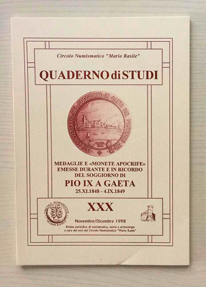 Circolo Numismatico “Mario Rasile” Quaderno di studi XXX, Formia, Novembre-Dicembre 1998. Medaglie e “Monete Apocrife” emesse durante e in ricordo del soggiorno di Pio IX a Gaeta 25.XI.1848- 4.IX.1849. Brossura ed., pp. 56, illust